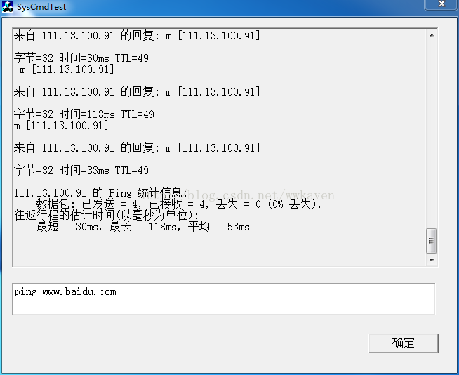 主要实现方法是建立一个新进程,用于运行一个隐藏窗口的CMD程序,进而通过匿名管道获取执行结果。注意一点,这样的方法每执行一条命令都会打开一个新的CMD窗口,只不过普通命令在执行完后会自动关闭。但是,ping命令加上参数“-t”,将会一直执行,所以相对应的CMD窗口也会一直存在,需要自行关闭。