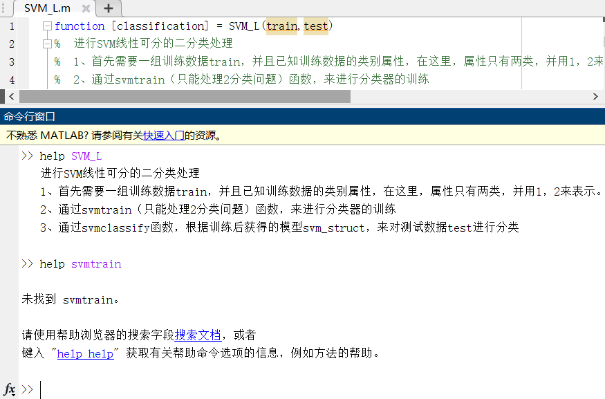 试一下help,如下图所示,SVM_L是可用的,但找不到svmtrain这个函数。首先我确认了下这个函数名字没有写错。