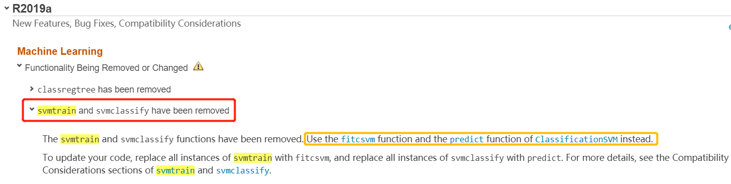 什么?我才发现,这个函数被移除了……那咋整?看黄框的内容——用替代函数吧,fitcsvm和predict这两个。