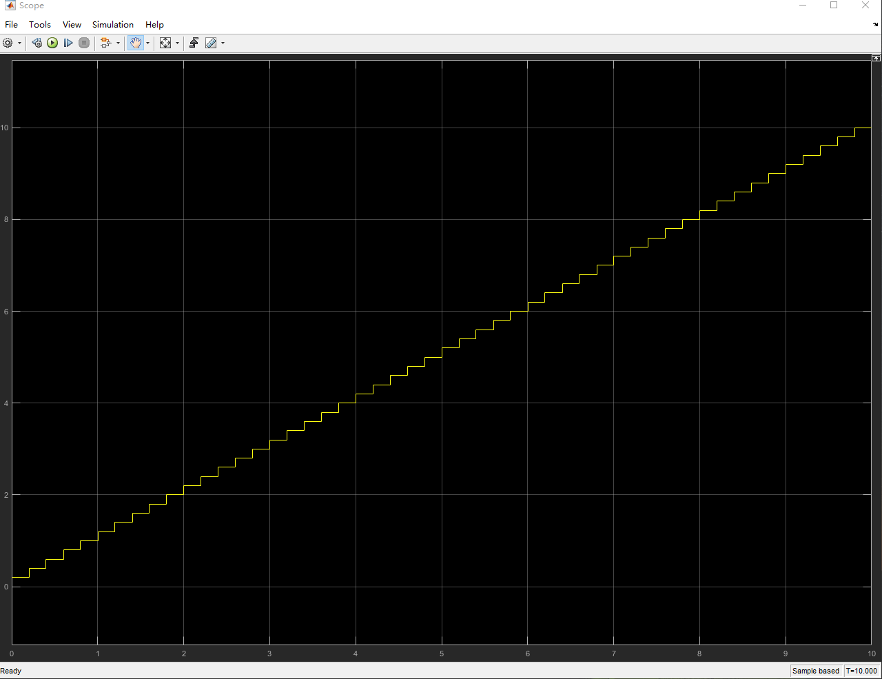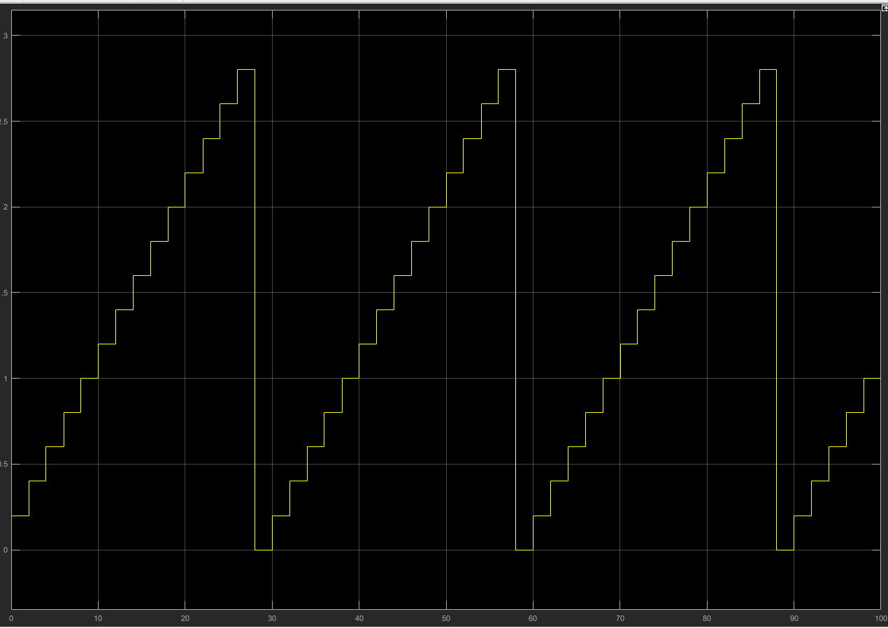 可以通过改变S的大小改变输出信号和真实时间的关系,这里的关系是1:1。由于占空比的问题,计时如图所示有脉冲,将switch的Threshold改为-1(小于零的值均可)。结果如下图3所示: