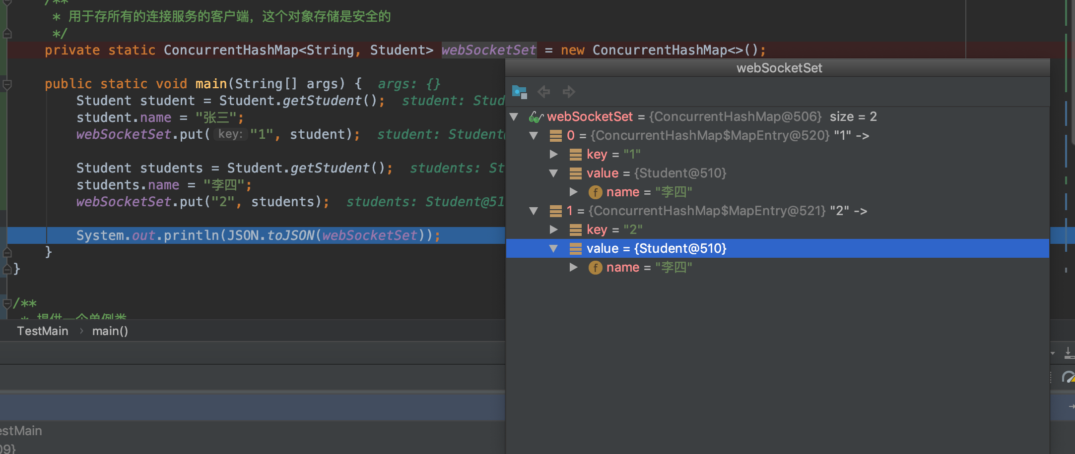 private static ConcurrentHashMap<String, Student> webSocketSet = new ConcurrentHashMap<>();