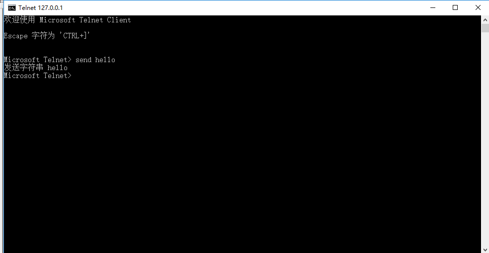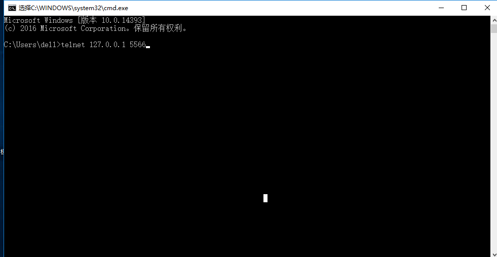 运行上面的代码启动服务端,用DOS命令窗口作为客户端,命令为:telnet 127.0.0.1 5566,如下: