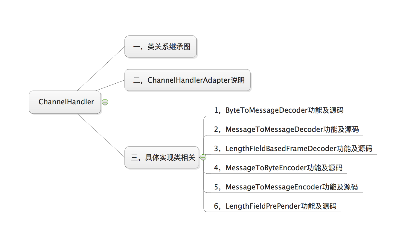 上篇我们讲述了消息容器ChannelPipeline的相关知识,这篇我们来看下由它管理的,负责对I/O事件或者I/O操作进行拦截和处理,可以选择性的拦截和处理自己感兴趣的事件,也可以透传和终止事件的传递,也是由我们亲自实现的ChannelHandler业务处理。而Netty也帮我们实现一些通用的Handler,我们直接用就可以,前边写的例子中应该都有体会。我们还是来先看知识思维导图吧: