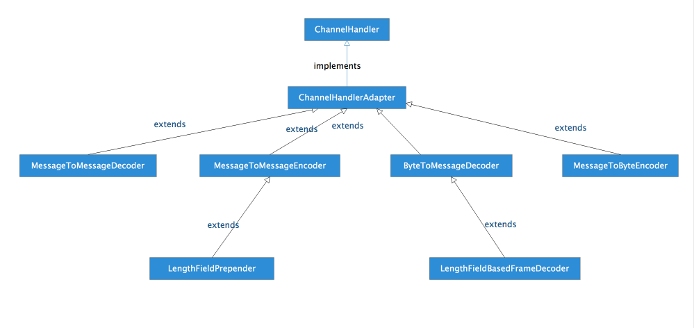 一,类关系继承图:由于Netty提供了很多Handler,例如:对I/O操作和事件进行预处理的,编解码的,流量整形、读写超时、日志等等,这里给出几个典型的编解码Handler的讲解,也是前边写的示例中我们用的。先看下类的关系图吧: