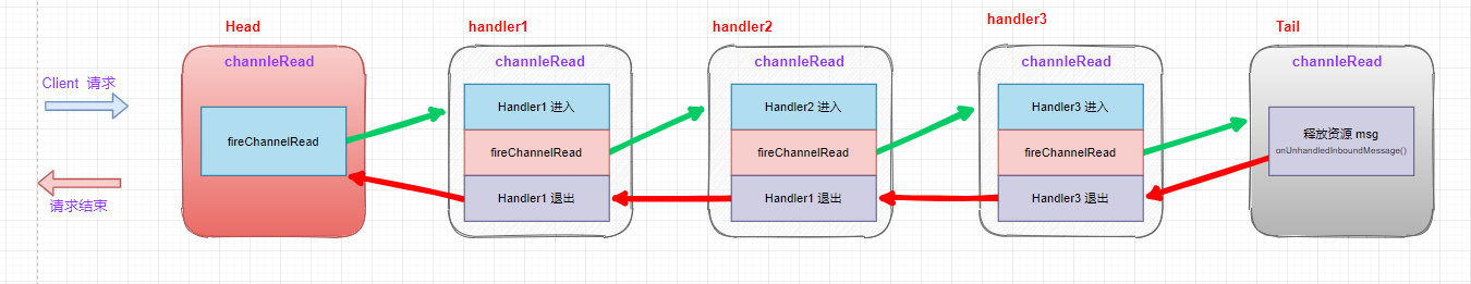 channelRead方法@Override public void channelRead(ChannelHandlerContext ctx, Object msg) throws Exception { System.out.println("InboundHandler3 进入 " + msg); ctx.fireChannelRead(msg); System.out.println("InboundHandler3 退出 " + msg); }