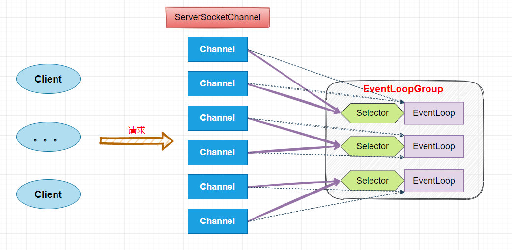 Netty 为每个 Channel 分配了一个 EventLoop,用于处理用户连接请求、对用户请求的处理等所有事件。EventLoop 本身只是一个线程驱动,在其生命周期内只会绑定一个线程,让该线程处理一个 Channel 的所有 IO 事件。