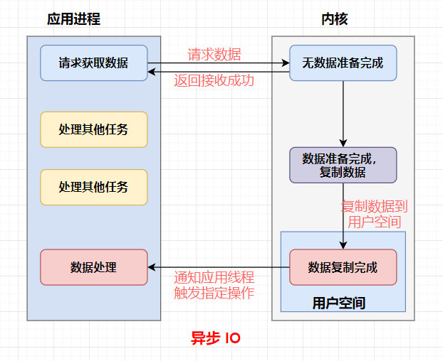 同步方式在处理 IO 事件的时候,必须阻塞在某个方法上面等待我们的 IO 事件完成(阻塞 IO 事件或者通过轮询 IO事件的方式),对于异步来说,所有的 IO 读写都交给了操作系统。这个时候,我们可以去做其他的事情,并不需要去完成真正的 IO 操作,当操作完成 IO 后,会给我们的应用程序一个通知。