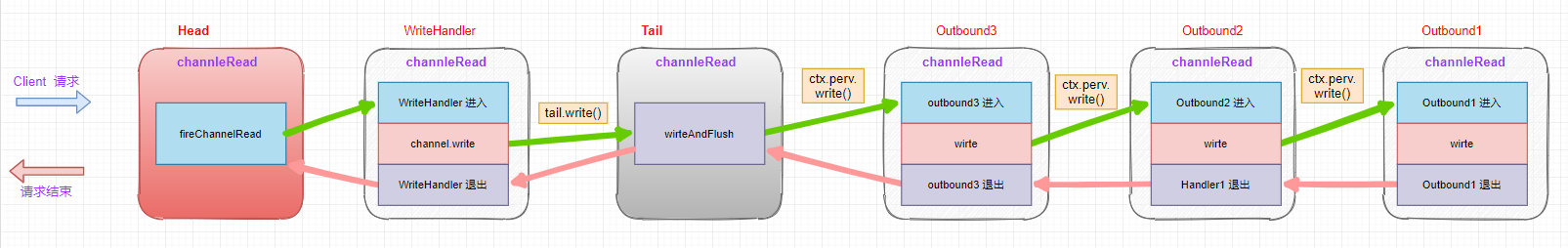 这里首先请求进入 Server 触发 Head 节点的 channelRead 方法执行,然后再获取下一个重写了 channelRead 方法的 Inbound 处理器,找到 WirteHandler 处理器,在 WirteHandler 处理器中掉用 Channel 的 writeAndFlush 方法,找到Tail 节点实现方法,调用了 Write 方法,然后获取 Prev 节点中重写了 write 方法的处理器,找到 Outbound3,然后依次调用 Outbound2 的 write 方法和 Outbound1 的 write 方法,执行完成依次返回。