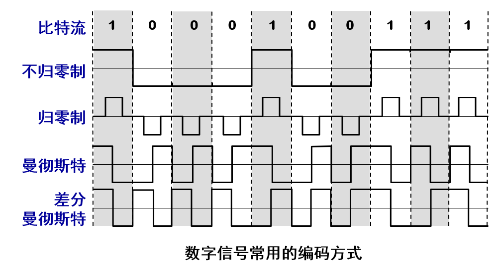 c.曼彻斯特编码:位周期中心的向上跳变代表 0,位周期中心的向下跳变代表 1。但也可反过来定义。
