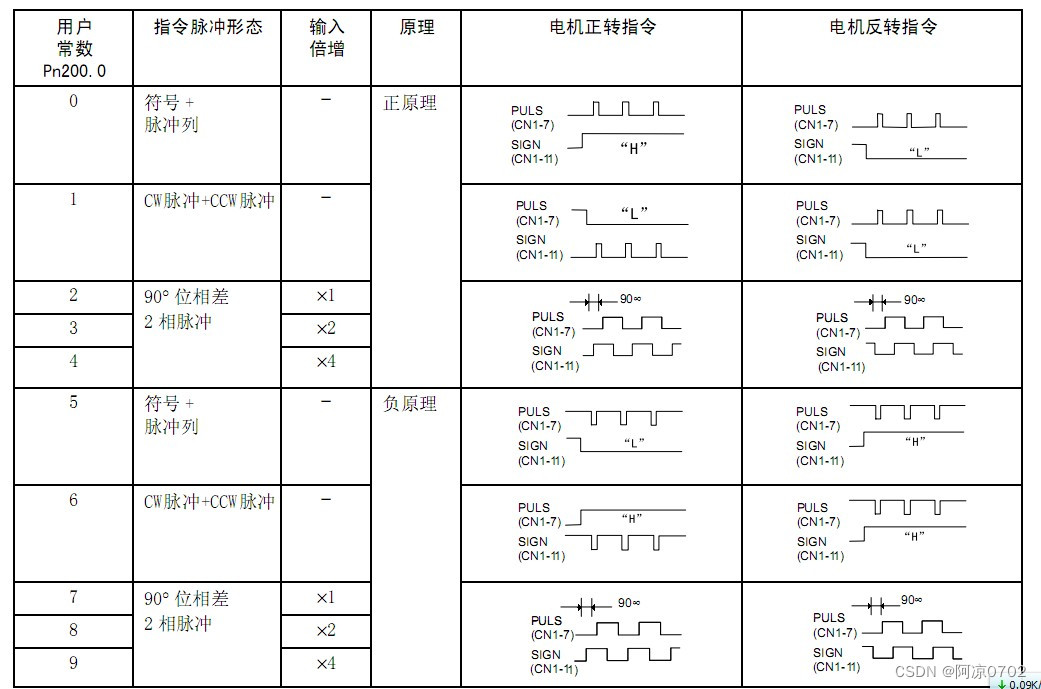 脉冲+方向,CW/CCW脉冲这2种,相对而言我认为CW/CCW相对好一点,因为脉冲+方向必须是方向正确后的脉冲才有正确的方向。如果切方向切在脉冲输入后,那么切方向前的脉冲就反了。