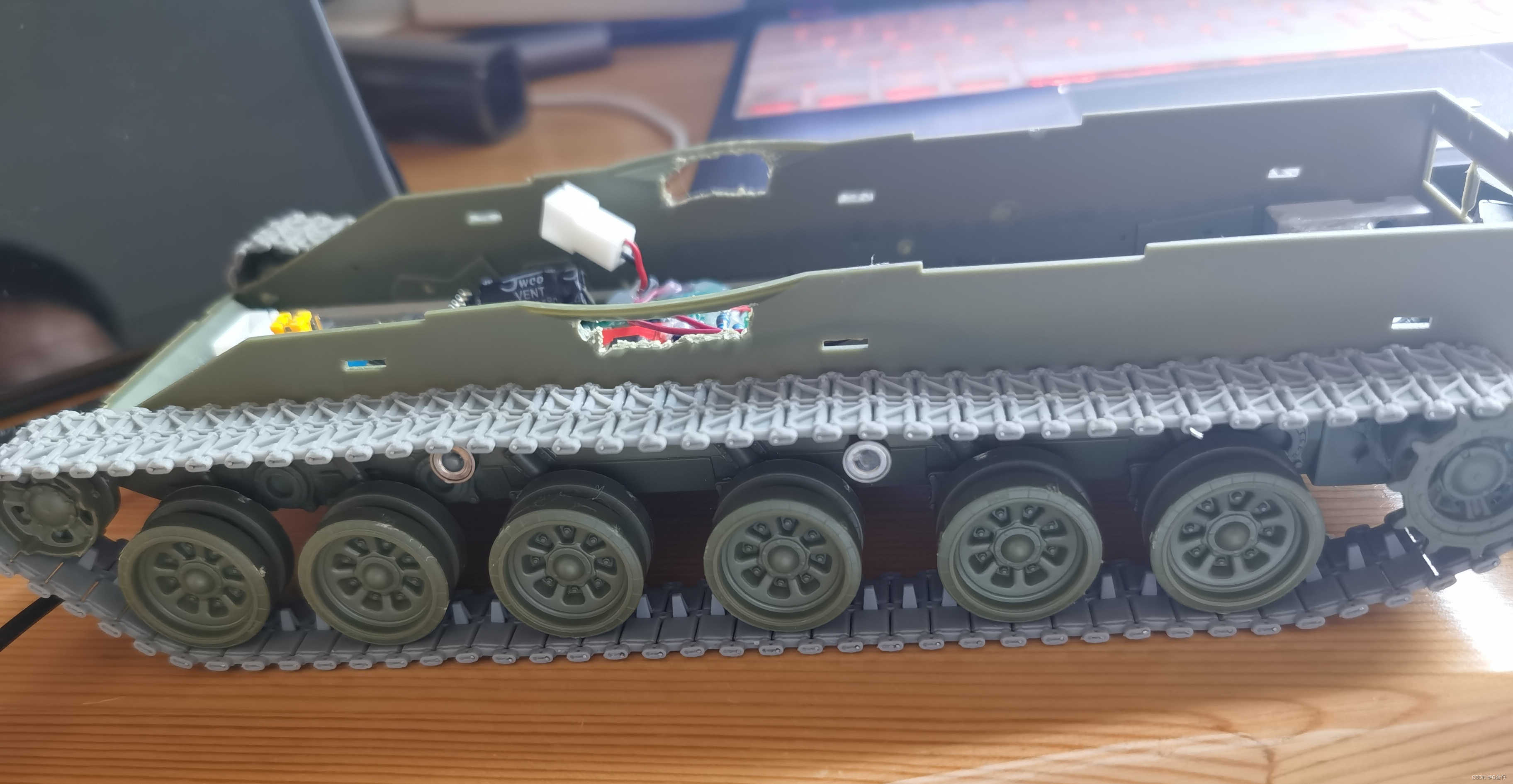 现阶段完成到底盘部分,由于tb套件的二次开发空间有限,所以开始考虑自己制作一版静改动解决方案。第一次做静改动,对空间使用的把握没有b数,所以就不考虑苏系车的圆脑袋了。综合考虑下选择了叹息之墙99a(小号手)。方形的脑壳便于安装设备,同时小号手内部空间巨大的优势体现得淋漓尽致。