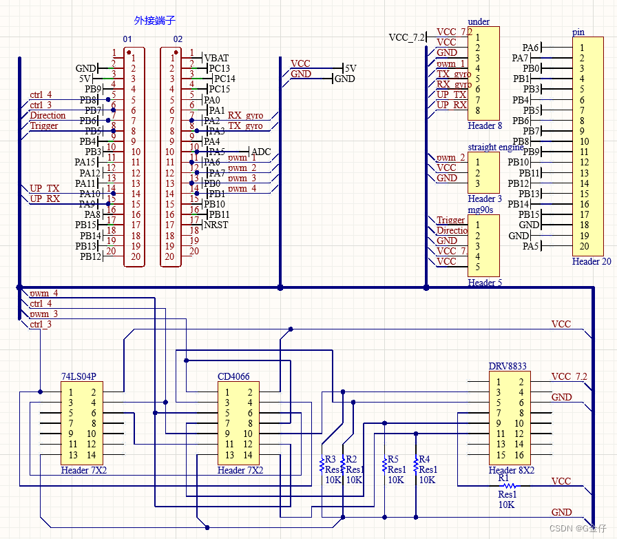 本来想找一块与l298n功能相似的模块。奈何实在是找不到,无奈之下采用了DRV8833与两块数字电路芯片自行制作了l2980相关功能。这样就能节省pwm波输出引脚,为后续增加舵机实现前倾,后倾,可调悬挂等动作预留了io接口。