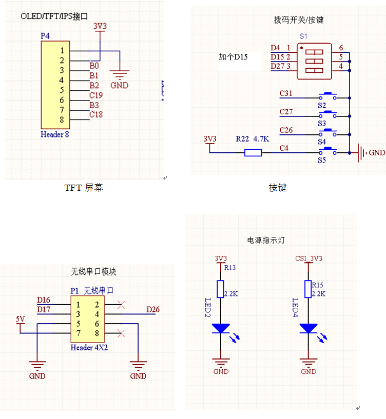 人机交互模块由 TFT 屏幕、按键、蜂鸣器、无线串口、发光二极管等组成。主要用于调整车模运行方式、告知车模使用者车模状态及显示相关工作参数。其部分电路原理图如图所示。
