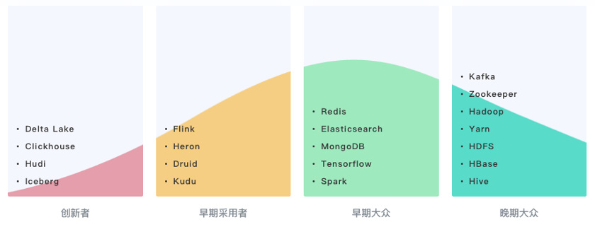 从上图可以看出,Hudi、Clickhouse、Delta Lake 等开源软件还处于创新者的阶段,即在工业界采纳还比较少,对于想学习新项目的同学是可以重点关注的。但是现在这些开源软件还不适合应用在需要长期维护的成熟应用场景里面。