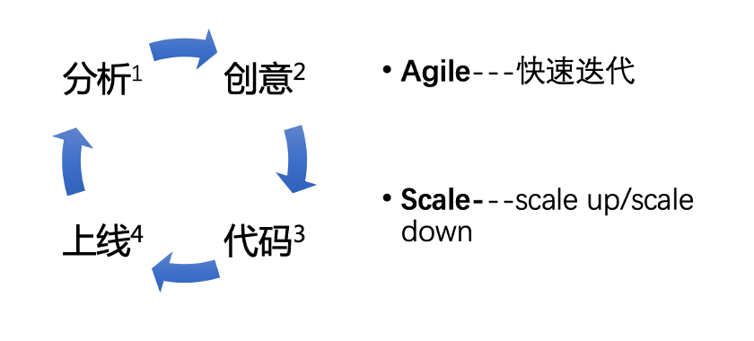 如上图所示,现代计算机软件或者服务的研发,是一个不断运行的循环和迭代过程。从市场分析开始,然后进入到创意阶段,再到编码阶段,最后到上线阶段完成应用的部署和生效,上线之后根据得到的数据反馈,继续进行分析。这个循环迭代的过程,显然对于一个身处竞争激烈的行业的企业来说,迭代的速度越快越好,同时也需要具备快速弹性、低成本伸缩的能力,即产品方向对了,那么赶紧进行系统扩容,承接快速增长的流量,做到快速增长;如果产品方向不对,需要赶紧缩容,把相关硬件和人力资源节省出来,投入到新的试错方向上去。身处同一个行业内的企业,如果企业 A 能以更低的成本,更快的速度的进行各种产品和策略的迭代,显然它是能比迭代速度慢,成本高的企业 B 是有更好的竞争优势的。
