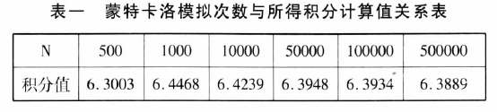 上述三条语句完整实现了蒙特卡洛计算上述定积分步骤.第一条语句是设定了停止条件, 共做N次Monte Carlo 模拟.第二条语句实现了在积分区间上均匀产生N个随机数.第三条语句实现蒙特卡洛计算方法的面积逼近.对N设置不同的值,观察所得蒙特卡洛计算方法定积分值,如表1所示,我们可以发现:当不断增大N值时,所得结果越来越接近真实值.