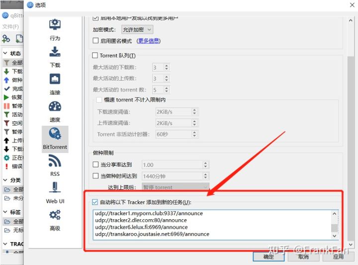 打开 qBittorrent -> 工具 -> 选项 -> BitTorrent,下拉到末尾,将 trackers 粘贴进输入框,并勾选 “自动添加以下 trackers 到新的 torrents”,OK。