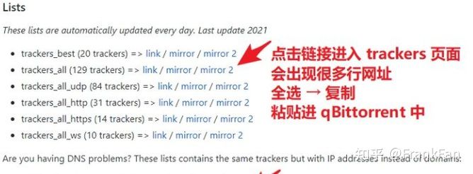 打开上面的网站,进入 trackers 页面,全选 → 复制。trackers 是用来优化下载速度的,多多益善。