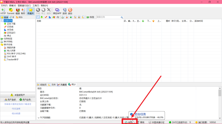 3.导入完成后,比特彗星的窗口的最下面会出现【后台任务状态图标】。只有当【后台任务状态图标】消失之后,才能“退出彗星”或“关闭电脑”或“再导入另一个导出文件”,否则本次导入失败。