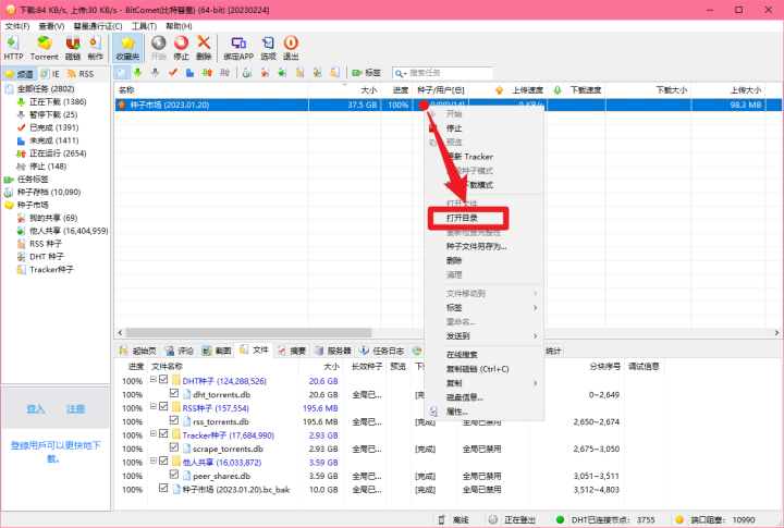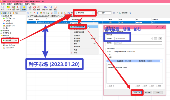 ③把【种子市场 (2023.01.20)】复制到比特彗星安装路径中的文件夹”下载完成后,右键点击【种子市场 (2023.01.20)】,点击【打开目录】