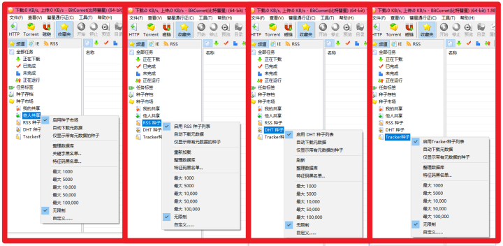 ③在种子市场栏,依次右键点击【他人共享】、【RSS种子】、【DHT种子】、【Ttacker种子】,按下图进行设置