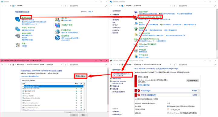 点击【控制面板→系统和安全→Windows Defender防火墙→允许应用或功能通过Windows Defender防火墙→更改设置】