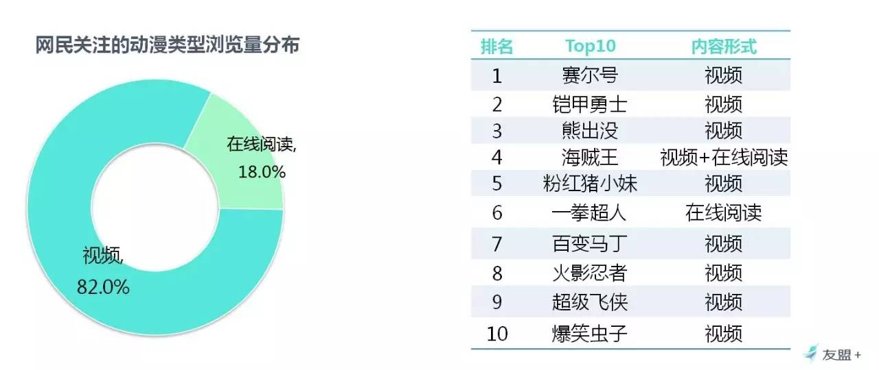 从关注的内容分布来看,动漫网民比较青睐视频形式的动漫,视频形式动漫流量占比82%,在线阅读占比18%;