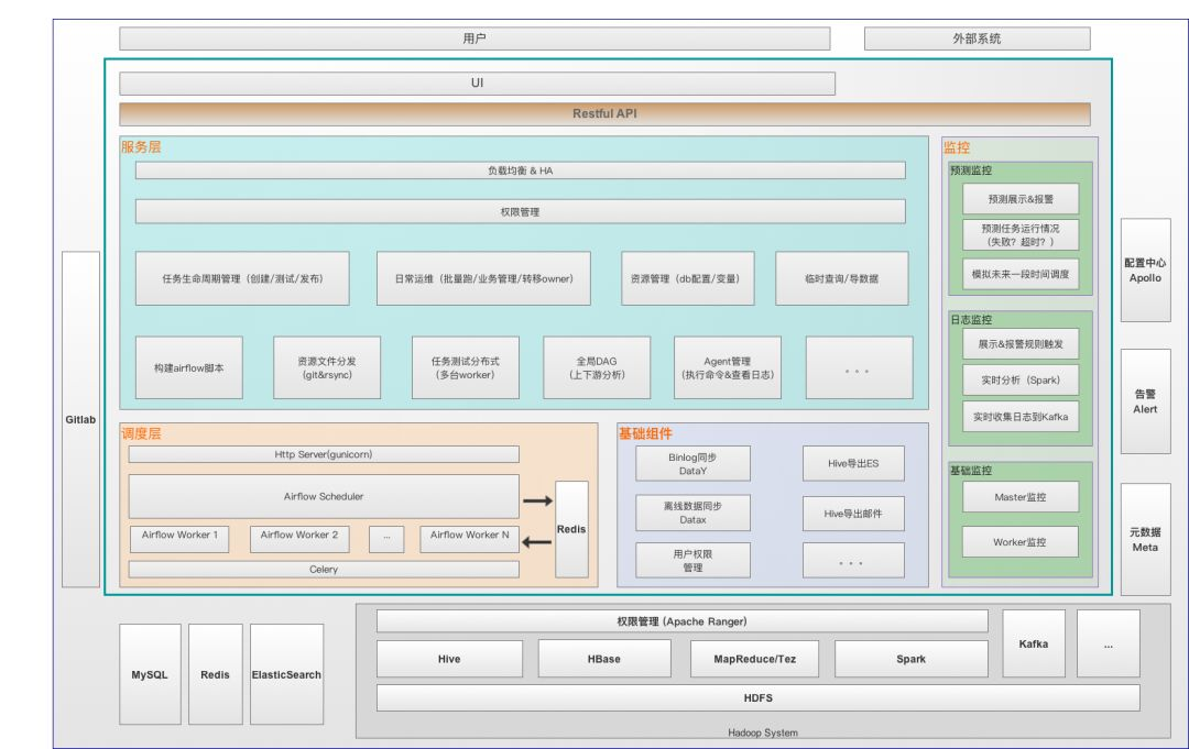 大数据开发平台包括调度模块(基于开源 airflow 二次开发)、基础组件(包括公共的数据同步模块/权限管理等)、服务层(作业生命周期管理/资源管理/测试任务分发/Slave管理等)和监控(机器资源/日志/基于预测的监控)。这些模块具体功能和职责为: