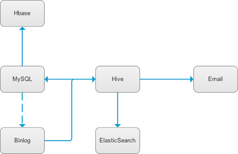 从 MySQL 通过 Binlog ,经过 Nsq/Hdfs/MapReduce 增量同步到 Hive( Datay ,自研)