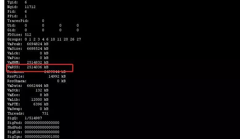 查看当前 pid 的状态,其中有一个字段VmRSS 表示当前进程所使用的内存,然而我们发现用户当前进程所占用的内存才2.3G 左右。