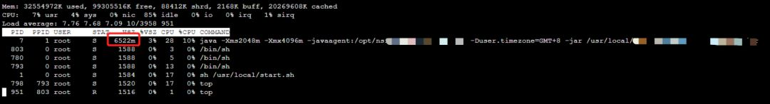 执行 top 命令查看下当前 pod 正在运行的进程,发现在容器里面有一个 7 号进程 VSZ 占用 6522m,这里先简单说明下 top 看到的一些和内存指标相关的参数含义: