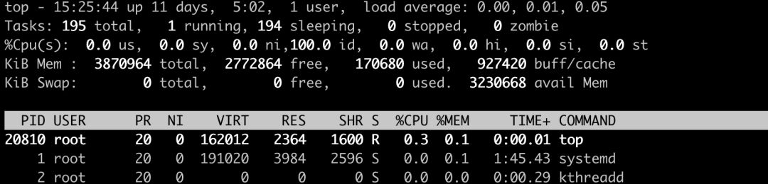 而且不知道大家有没有发现,容器里面执行 top 看到的信息很少,我们对比下实际操作系统的 top 命令执行结果多了很多列,例如RES、 %MEM 等等。