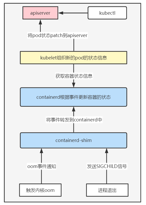 - 容器的退出原因OOMKilled是如何经由containerd更新到kubelet,并最终更新到Pod的status中。