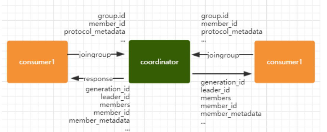 表示加入到 consumer group 中,在这一步中,所有的成员都会向 coordinator 发送 joinGroup 的请求。一旦所有成员都发送了 joinGroup 请求,那么 coordinator 会选择一个 consumer 担任 leader 角色,并把组成员信息和订阅信息发送消费者。下图就是描述了这么一个过程,并且请求与响应中携带的一些重要的信息。