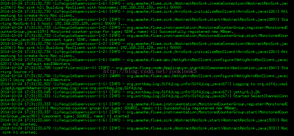 与之前复制的情况一样,首先先启动2个接受复制事件代理,如果先启动源发送的代理,会报他找不到sinks的绑定,因为2个接事件的代理还未起来。