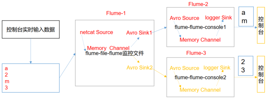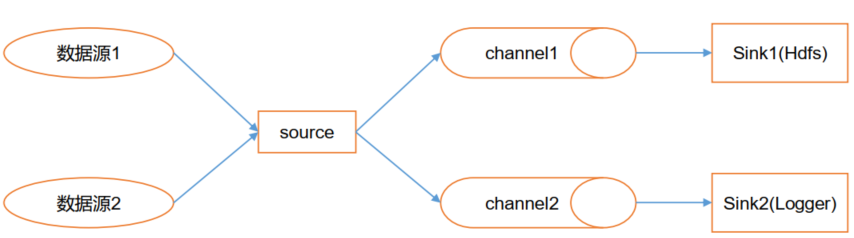 Flume 支持将事件流向一个或者多个目的地。这种模式可以将相同数据复制到多个,channel 中,或者将不同数据分发到不同的 channel 中, sink 可以选择传送到不同的目的地