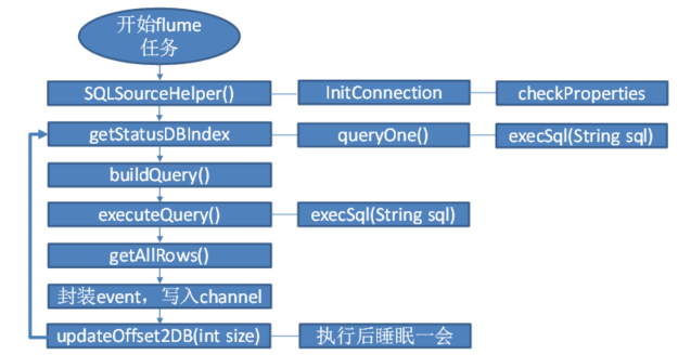 process()//获取数据(从MySql获取数据,业务处理比较复杂,所以我们定义一个专门的类——SQLSourceHelper来处理跟MySql的交互),封装成Event并写入Channel,这个方法被循环调用