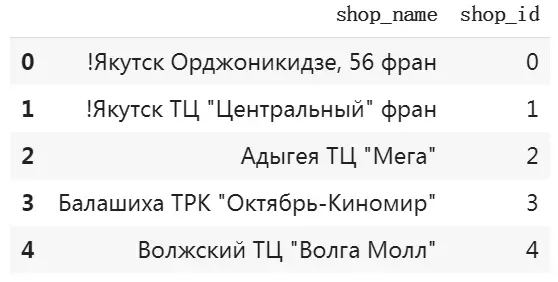仔细观察可以发现shop_name是有规律的,它通过’ '分隔,第一个字段是城市名,第二个字段(如果有的话)是店铺的类型(ТЦ、ТРЦ、ТК …),后面的字段则是店名。