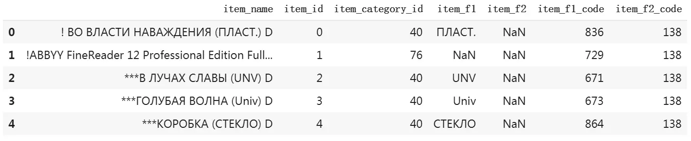 items['item_f1_code'] = LabelEncoder().fit_transform(items['item_f1'].fillna('xxx')).astype(np.int16)