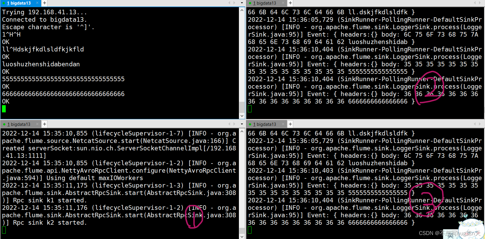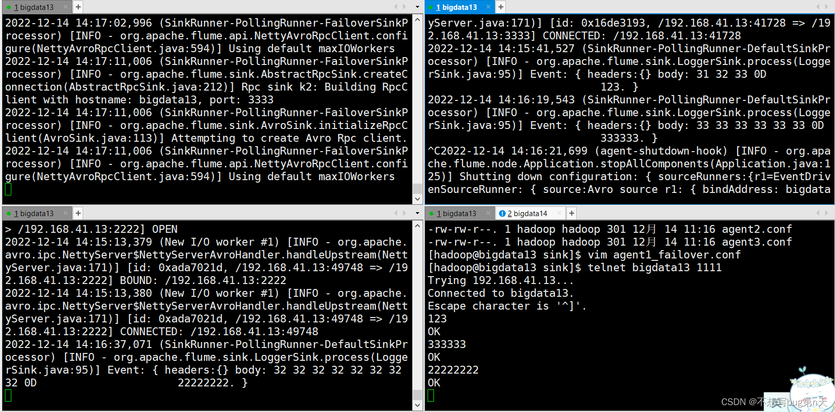 flume-ng agent --name agent1 --conf ${FLUME_HOME}/conf --conf-file /home/hadoop/project/flume/sink/agent1.conf -Dflume.root.logger=info,console - 启动:[hadoop@bigdata13 sink]$ telnet bigdata13 1111