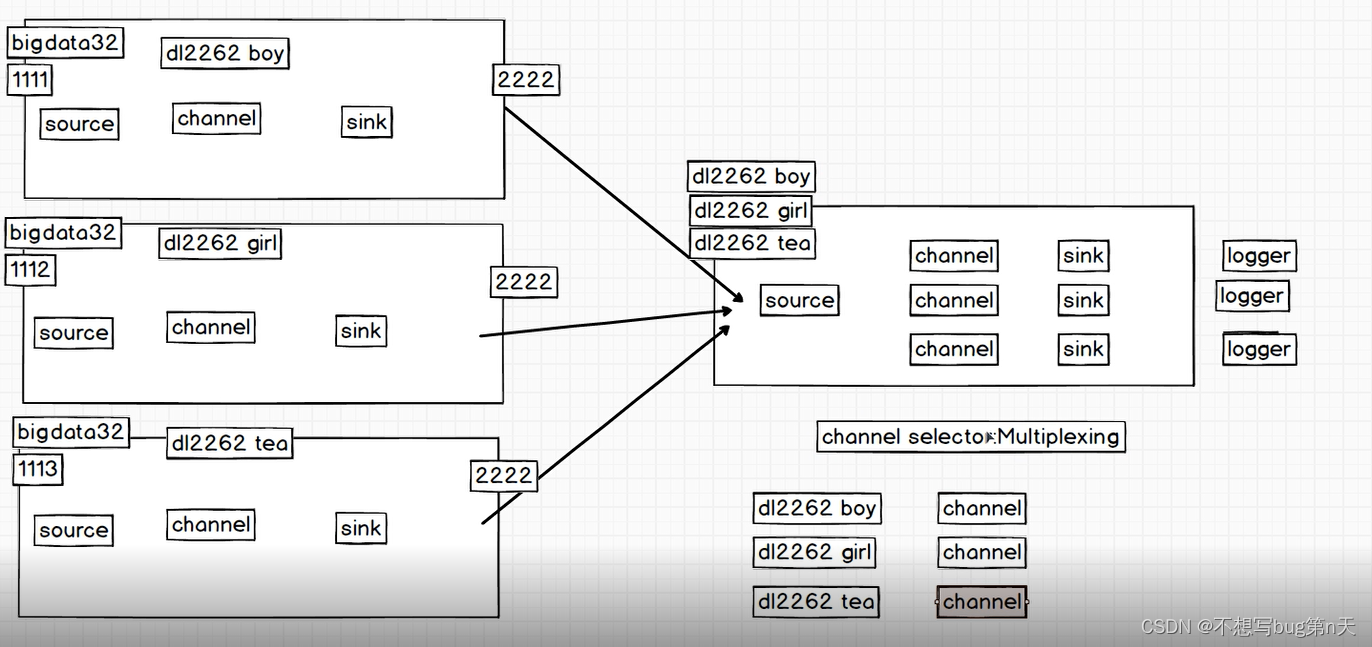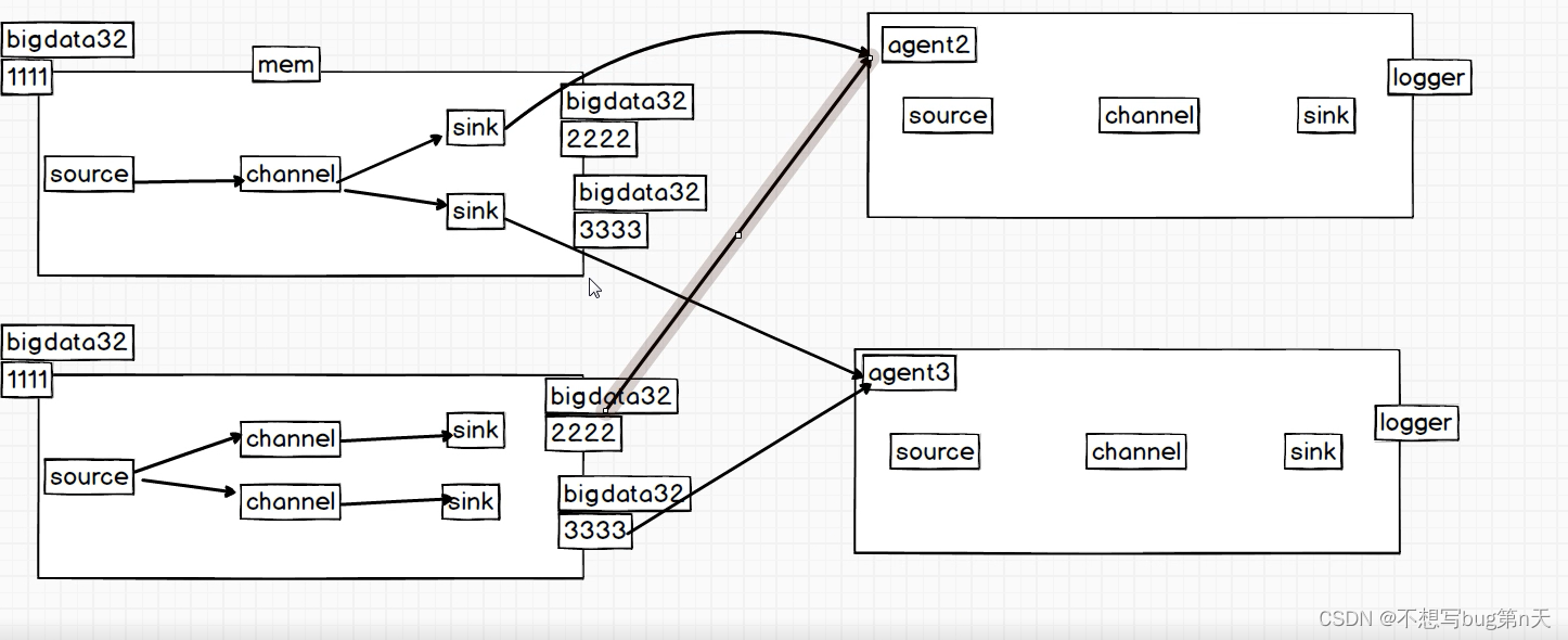 [hadoop@bigdata13 sink]$ vim agent2.conf#agent2:2222端口 agent2.sources = r1 agent2.sinks = k1 agent2.channels = c1 agent2.sources.r1.type = avro agent2.sources.r1.bind = bigdata13 agent2.sources.r1.port = 2222 agent2.channels.c1.type = memory agent2.sinks.k1.type = logger agent2.sources.r1.channels = c1 agent2.sinks.k1.channel = c1 - 配置agent3.conf文件