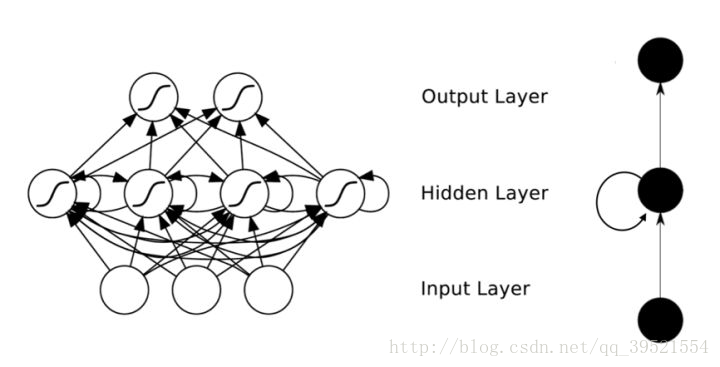 在普通的全连接网络或CNN中,每层神经元的信号只能向上一层传播,样本的处理在各个时刻独立,因此又被成为前向神经网络(Feed-forward Neural Networks)。而在RNN中,神经元的输出可以在下一个时间戳直接作用到自身,即第i层神经元在m时刻的输入,除了(i-1)层神经元在该时刻的输出外,还包括其自身在(m-1)时刻的输出!表示成图就是这样的: