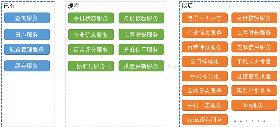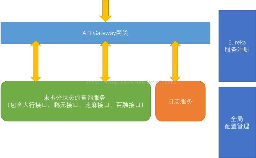 痛点:微服务的进程还处在初级阶段。查询服务上一个大粒度的服务。当遇到其中一个数据接口需要升级,其他接口直接受到影响,需要做回归测试、同时有短时间的服务不可用。