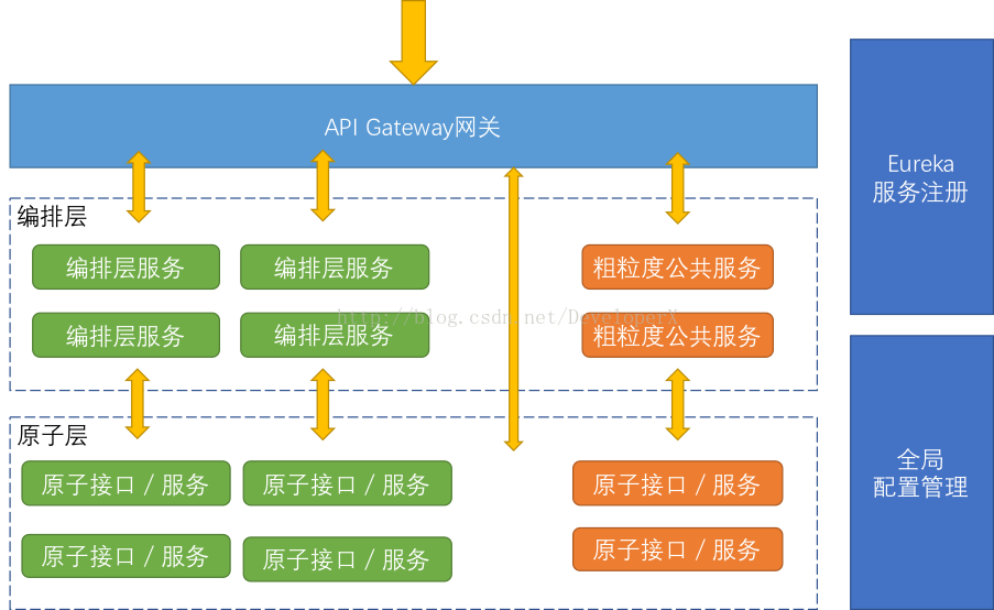 - 拆分过程首先产生中粒度的编排层服务和小粒度的原子层服务。