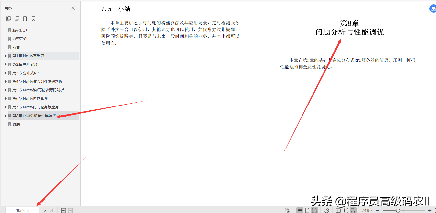 **第8章问题分析与性能调优;**本章主要讲解了服务器代码的部署、Jmeter压测、线上问题定位及解决的实战经验、性能调优的方案。服务器代码的部署也是应用开发过程中很重要的部分,对于未接触过Netty的读者有一定的帮助。一般开发人员平时很少接触Jmeter压测,大部分都是测试的工作。但在测出服务性能问题后,需要研发人员及时找到性能瓶颈并优化。至于线上问题定位与性能调优,是程序员在成长路上的宝贵经验,需要一定的积累。遇到的问题越多,解决问题的能力就会提升得越快。Netty的应用场景非常广,不只是做RPC,它在IM即时通信、物联网及游戏开发中都被大量使用。