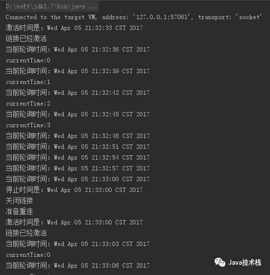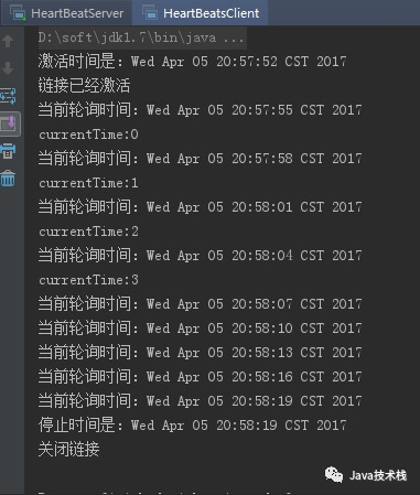 其余部分的代码与上面的实例并无异同,只需改造客户端即可,我们再运行服务端和客户端会看到客户端虽然被关闭了,但是立马又被重启: