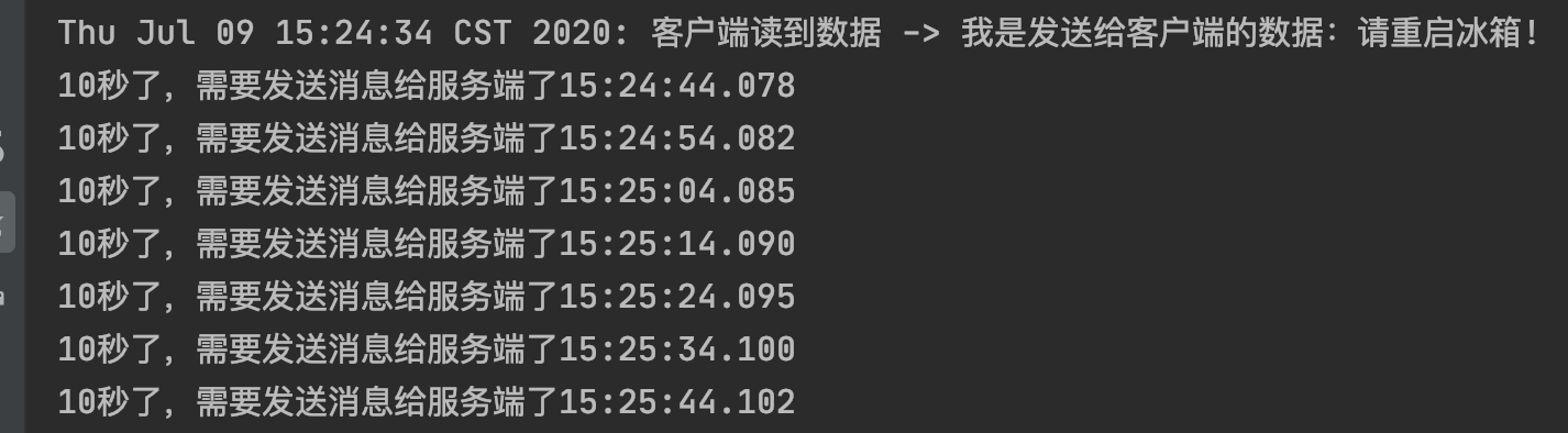 System.out.println("10秒了,需要发送消息给服务端了" + LocalTime.now());