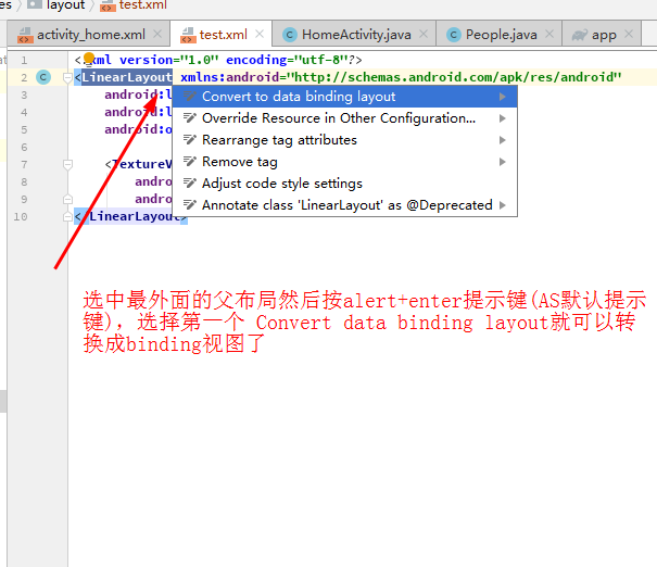 然后将你要绑定的xml布局视图转换成Binding视图: