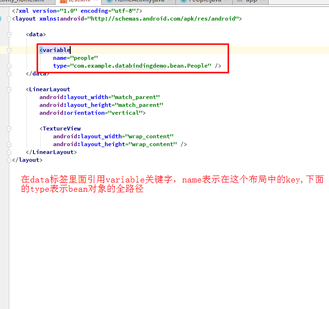 数据绑定的规则:@{},这个大括号里面的就是我们设置的数据,people就是上面xml布局中的data标签中的name字段,people.work代表的是获取com.example.databindingdemo.bean.People这个路径下面的bean对象里面的work字段,其它字段同理