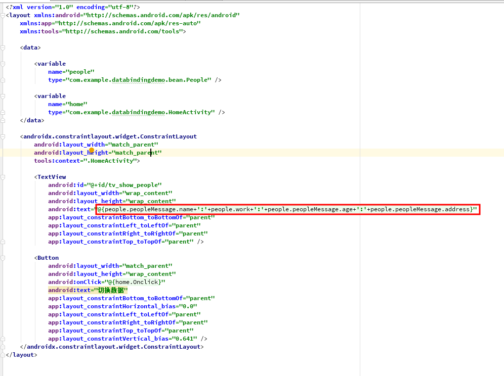 android:text="@{people.peopleMessage.name+':'+people.work+':'+people.peopleMessage.age+':'+people.peopleMessage.address}"